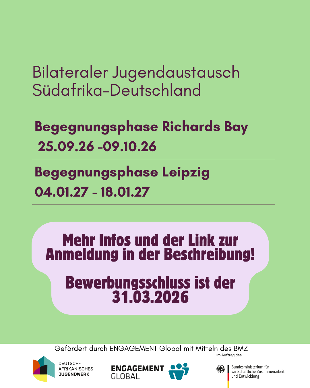 Unser neues internationales Projekt Change Makers hat gestartet! In diesem deutsch südafrikanischen Jugendaustausch setzen sich junge Erwachsene gemeinsam mit SDG 4 hochwertige Bildung und der Frage auseinander, wie Bildung gerechter werden kann. In zwei Begegnungsphasen in Richards Bay (Südafrika) und Leipzig arbeiten die Teilnehmenden in gemischten Teams, lernen voneinander und entwickeln konkrete Ideen und Formate für mehr Teilhabe.Mach dir keine Gedanken darüber, professionell zu klingen. Klinge einfach wie du selbst. Es gibt über 1,5 Milliarden Websites da draußen, doch es ist deine Geschichte, die diese von allen anderen unterscheiden wird. Wenn du deinen Text laut vorliest und in deinem Kopf nicht deine eigene Stimme hörst, ist das ein gutes Zeichen dafür, dass du noch Arbeit vor dir hast.